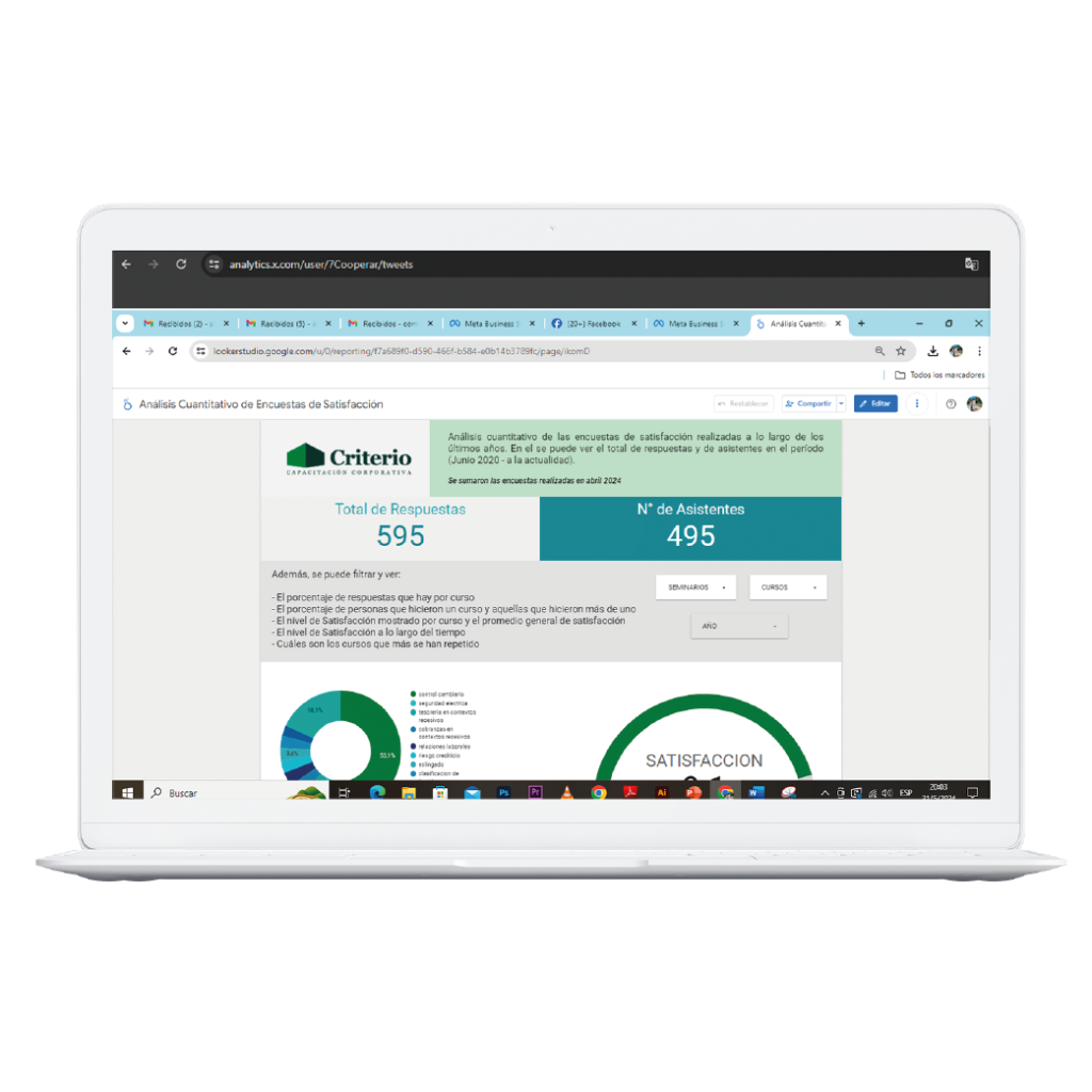 Hoy, luego de varios años de colaboración, hemos diversificado nuestro trabajo continuando con el diseño de banners e incorporando la edición de videos y la creación de encuestas de satisfacción a alumnos, cuya visualización se realiza en un tablero dinámico en Looker Studio, generando información estratégica y de valor para la empresa.